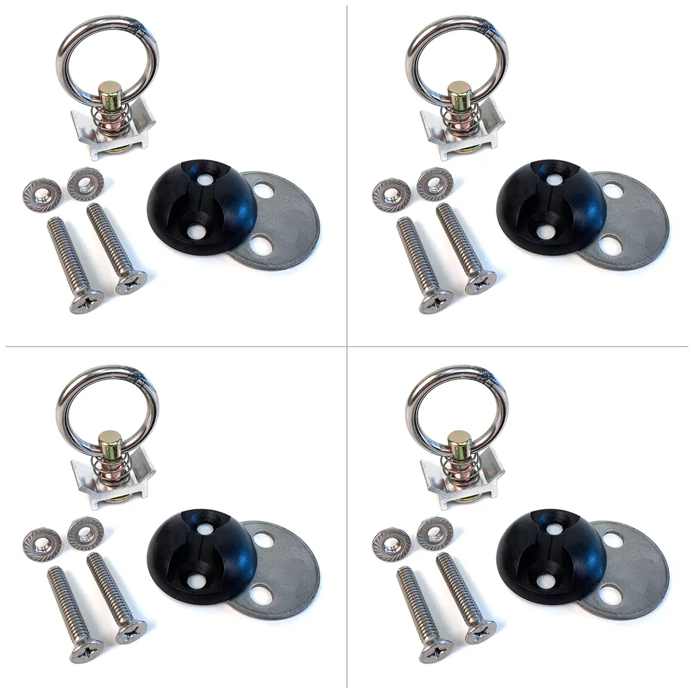 Sold as a pack of four, each tie-down ring can be pulled out when not in use, leaving only the smooth contoured, low profile black anodized anchor plate that will not get in the way of other cargo. Each anchor plate assembly includes one single-stud tie-down ring, one anodized aluminum anchor plate, one stainless steel backing plate, two whiz nuts and two ¼" stainless steel machine screws.