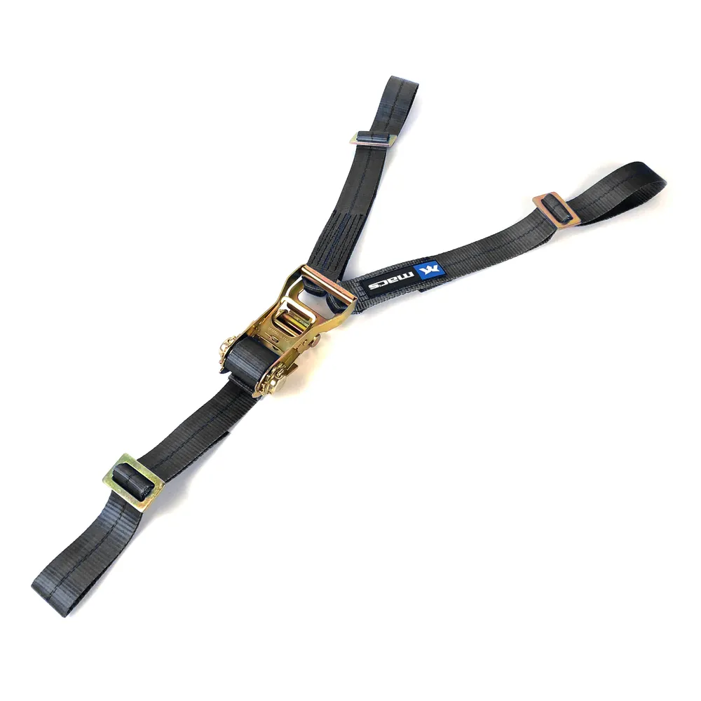 Mac's Y-Strap is built to survive. This racer-first approach to our equipment is also why Mac's Y-Straps look so good. Our Y-Strap is rated to 5,000 lb. Minimum Breaking Strength (MBS), giving you plenty of safety margin. The foundation of our Y-Strap is our premium webbing. This is the same 12,000 lb-rated material used on our vehicle tie-down straps. It offers superior UV and abrasion resistance, so you can count on years of survival through rough terrain. But strap assemblies are only as good as the stitching that holds them together. That's why each connection on a Mac's Y-Strap is sewn using the highest stitch count in the industry. All metal components on our Y-Strap now include our improved zinc coating for even better corrosion resistance.