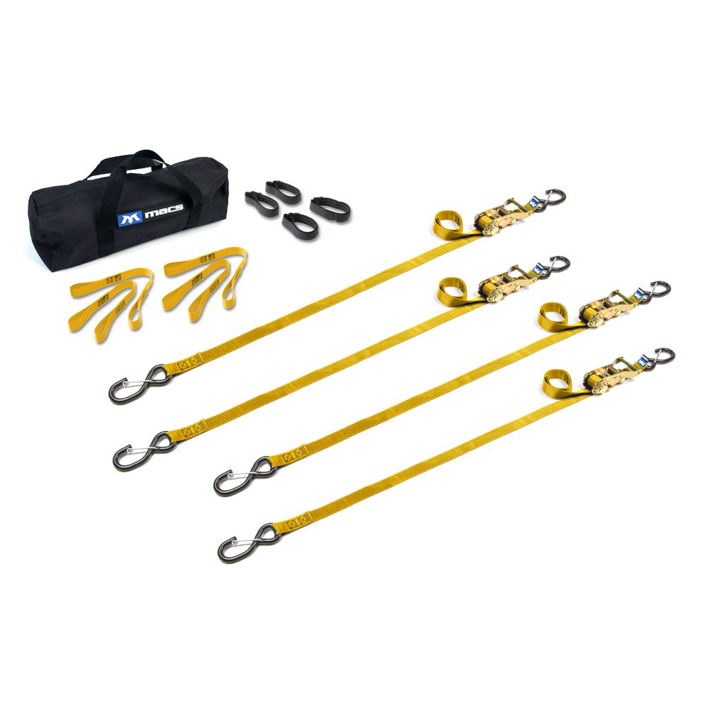 The ATV/Motorcycle Utility Pack includes four 1" ratchet tie-down straps with S-hook ends and keepers, four 18" soft loops, four strap bands and one small duffle bag. The S-Hooks on each of the tie downs are encased in a full coat of thick, ruggedized vinyl. Mac's 1" tie-down straps are well known for their strength and dependability, and there's a good reason why. It starts with our premium nylon strapping, rated to 2,800 lbs. Minimum Break Strength (MBS), which significantly improves chafing and UV resistance over box store straps.