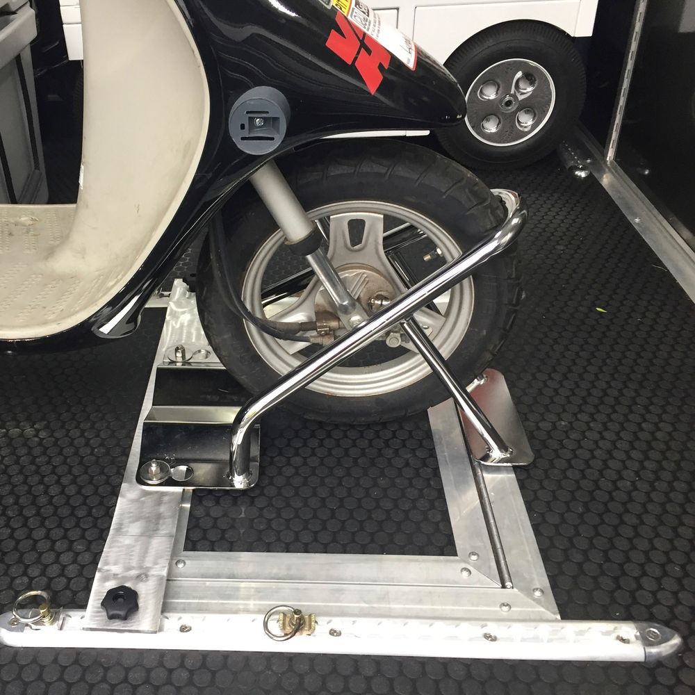 Due to its unique wedge-shaped design, the narrower the tire, the further into the chock it sits. The bike sits on top of a base plate when secured for ultimate stability.