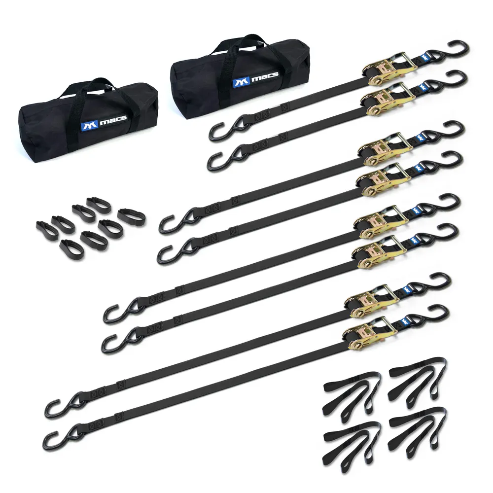 - What's included: (2) 6', (2) 8', (2) 10' and (2) 12' ratchet straps, (8) soft loops, (8) strap wraps, (2) small storage bags