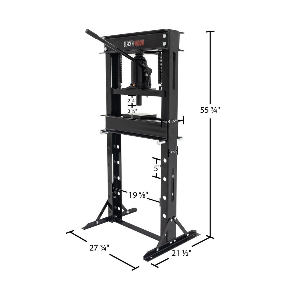 - 20-Ton capacity; measures 27.75" L x 21.5" W x 55.75" H; ram extends 2.75" to 10" from base