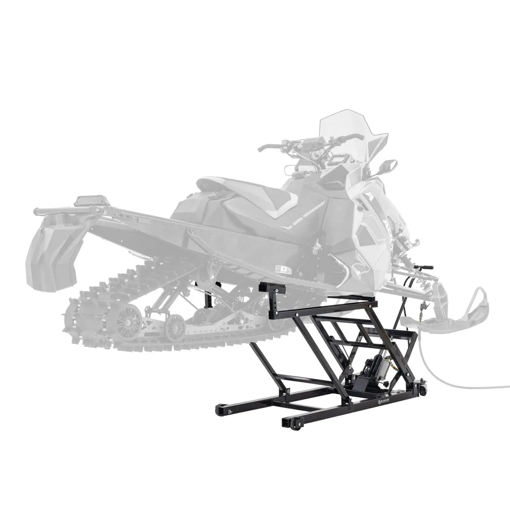 The powder-coated steel lift raises sled has four locking heights at 13.5”, 22.5”, 28” and 31.5” and features belted rubber pads to protect the underside of the snowmobile.