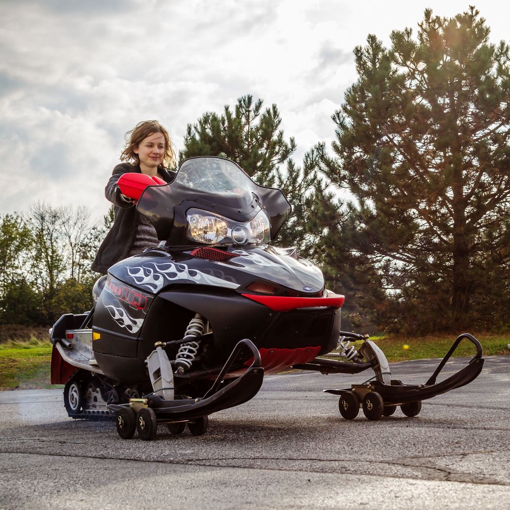Two ski dollies and one track dolly give you the option of moving your snowmobile by hand, or driving it carefully up to 5mph. The 360-degree rotation means tight turns for tight spaces, and it works on all terrain including grass and gravel.