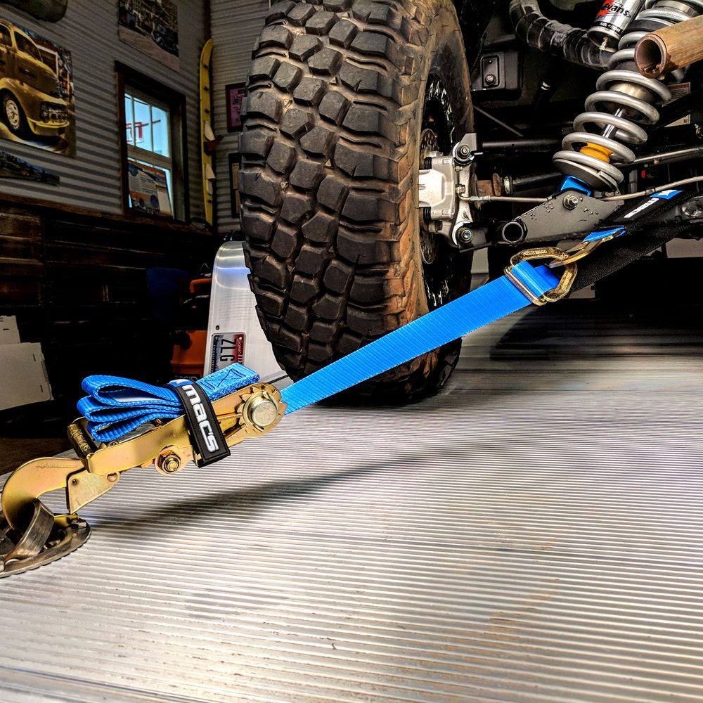 On the fixed end of the strap, we've integrated our adjustable combo axle strap, to make it easy to tie down to A-arms or through your wheels. It can even be used as a straight pull hook-to-hook. Use the wrap straps to neatly hold excess strapping in place after the vehicle is secured. And when you've arrived, use the strap wraps to bundle each strap for storage in the included Mac's Large Canvas Tool Bag.